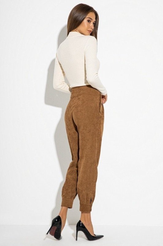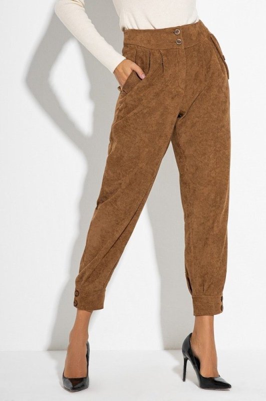 Брюки-бананы из микровельвета со складками на талии и широкими манжетами по низу брючин. По бокам предусмотрены вместительные карманы. Застегиваются на молнию и пуговицы спереди.