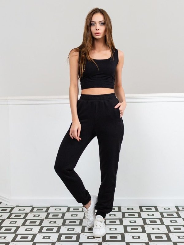 Традиционные брюки-джоггеры на широком эластичном поясе. По бокам карманы с листочками, внутри карманов подклада - сетка. В нижней части - манжеты.