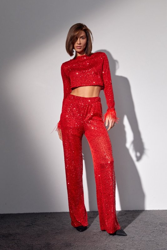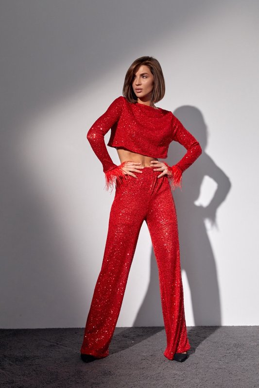 Брючний костюм с пайетками и перьями на рукавах - 9549 красный