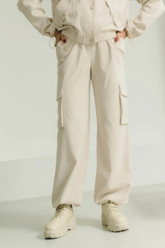 Декоративные элементы: накладные карманы, клапана, затяжка сбоку брюк