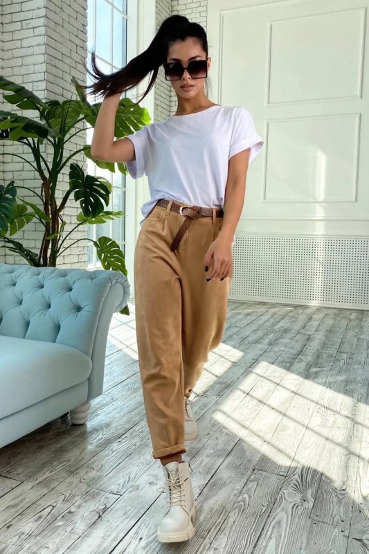 Широкие штаны с высокой посадкой. Материал – замша на дайвинге. Фасон свободный, широкий. Вытачки внизу брюк, карман с отрезным бочком.