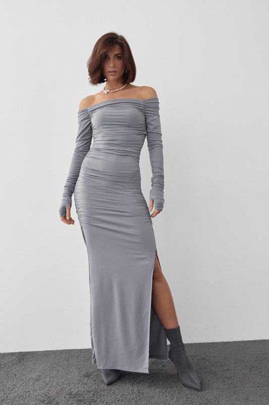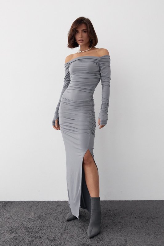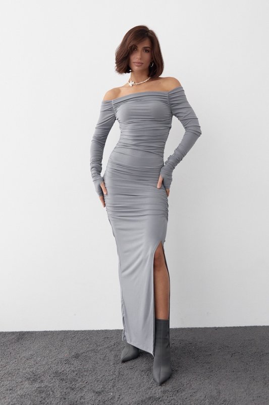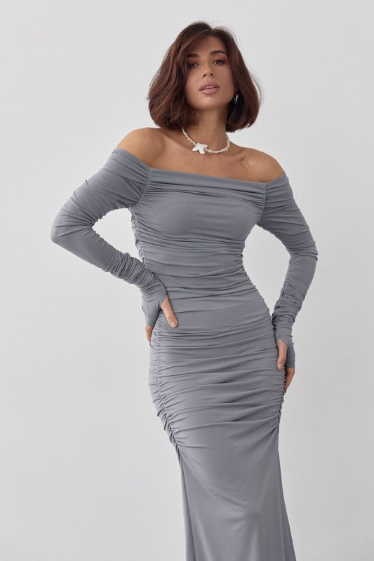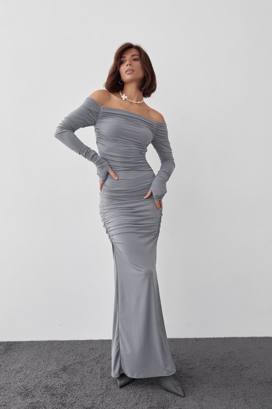 В модели длина макси и с левой стороны низ дополнен высоким разрезом. Боковые швы основной части изделия и рукава дополнены драпировкой на резинке. Низ рукавчиков имеет разрез для большого пальчика. Верху платье с открытыми плечами и дополнено короткой подкладкой из основной ткани.