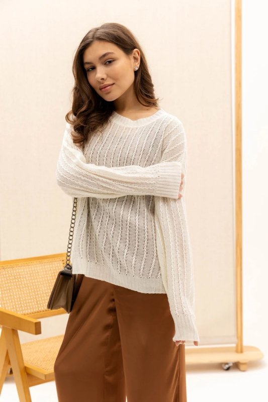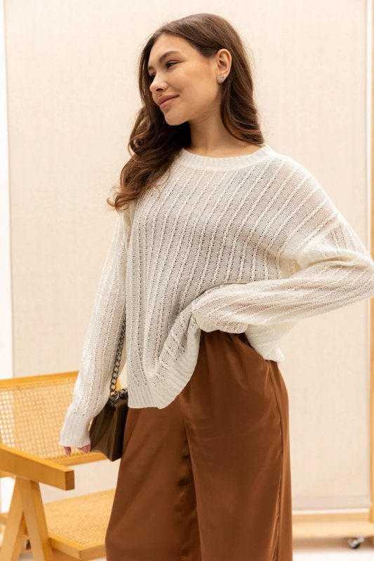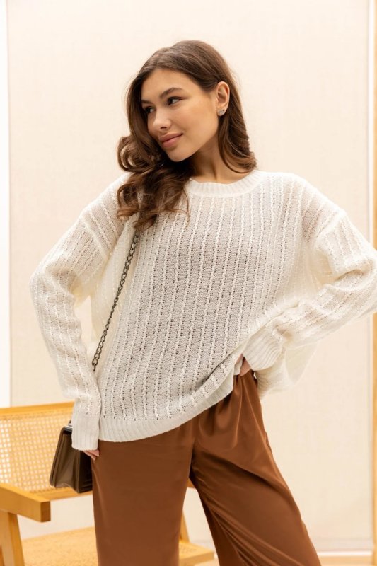 Изделие оверсайз изготовлено из высококачественной вязки, имеет элегантную круглую горловину и приспущенное плечо. Свободный фасон оверсайз раскрепостит движения, придаст уверенности.