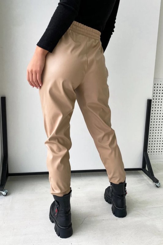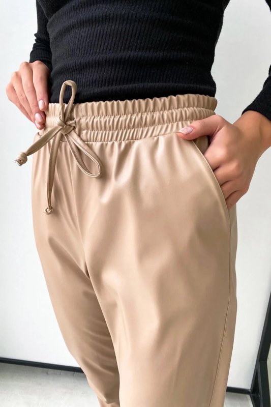 Свободные кожаные штаны. Пояс на резинке со шнурками. Манжеты на резинке. Высокая посадка. Карманы с отрезным бочком.