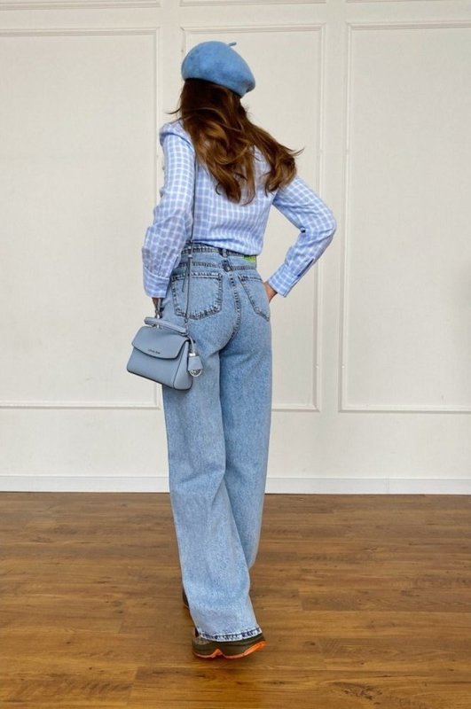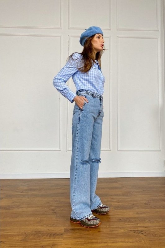 Широкие джинсы widе leg с высокой талией и декоративными дырками на коленях. Модель выполнена из светлого денима с высокой посадкой, подчеркивающая талию. Джинсы - идеальное решение для создания комфортных ультрамодных луков. Произведено в Турции.