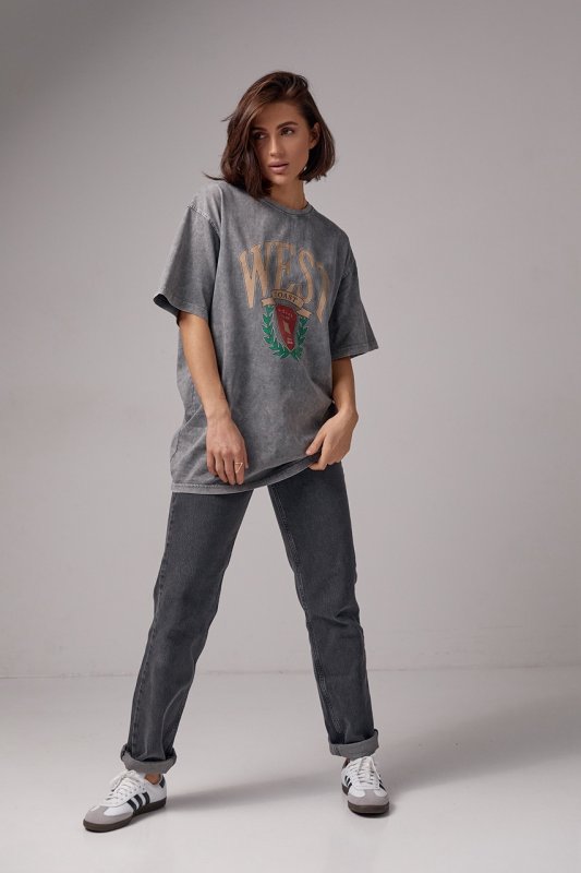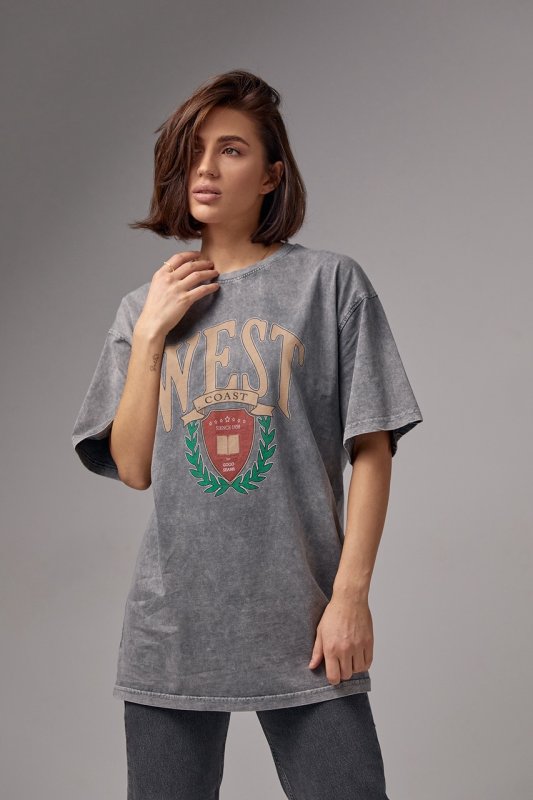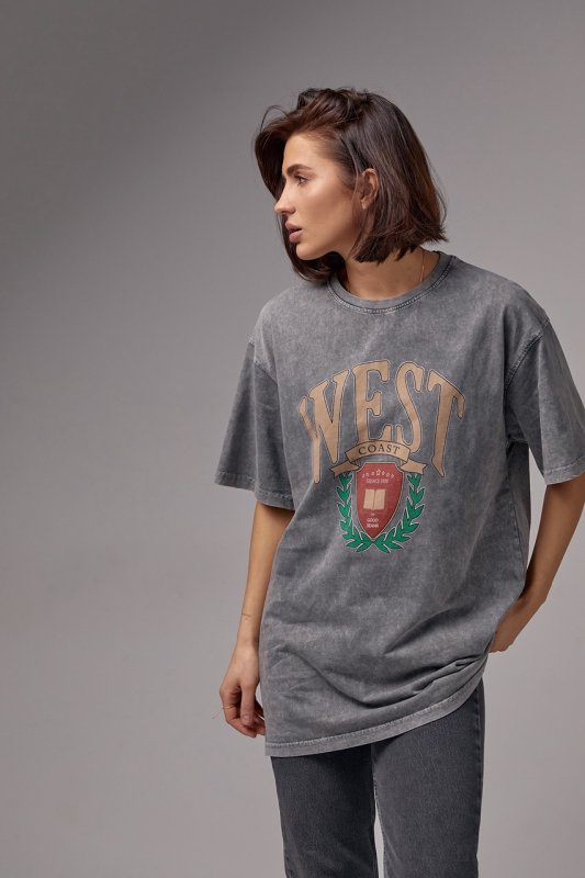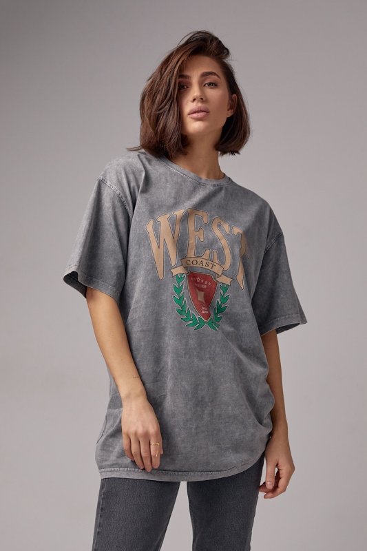 Наша новинка, кроме качественной ткани в технике тай-дай, имеет еще модный принт спереди и крупную надпись West. Благодаря такому принту, обычная футболка стает модной и стильной вещью, яка дополнит ваш летний образ. В модели линия плеча опущена, рукавчики короткие, круглая горловина обшита узкой окантовкой.