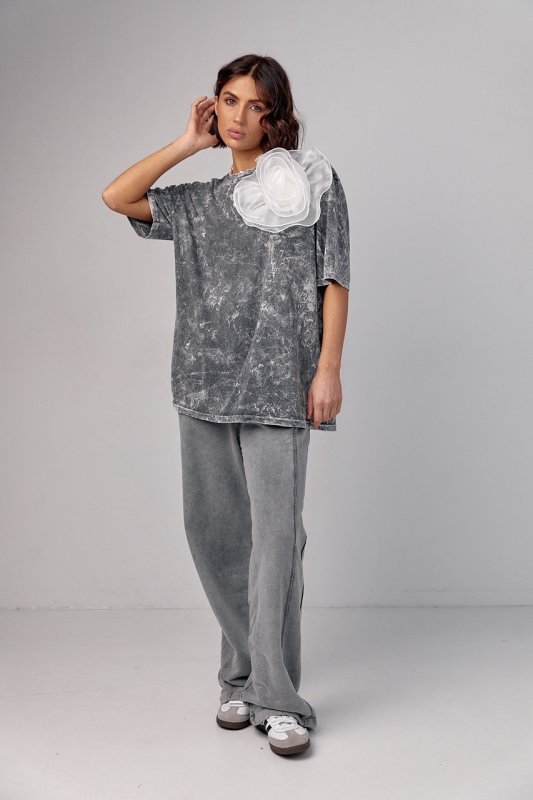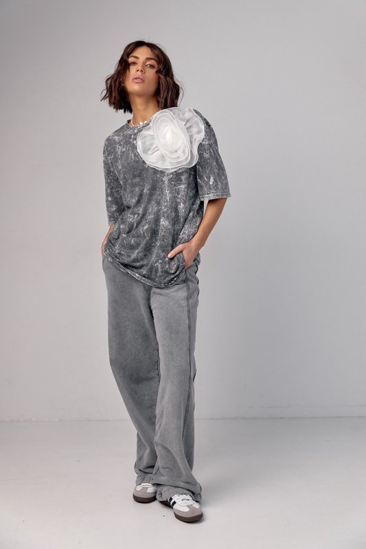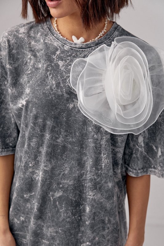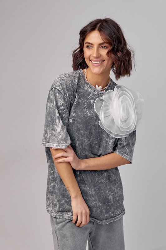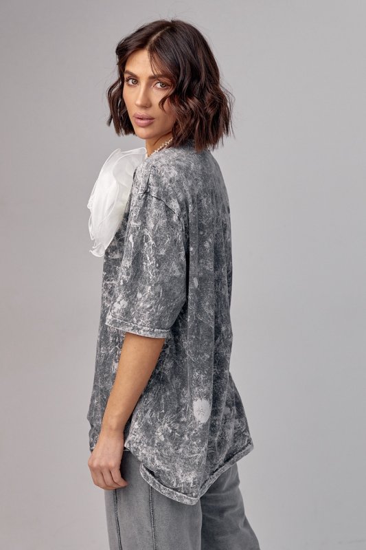 Футболка в технике тай-дай с объемным цветком - 12379 серая