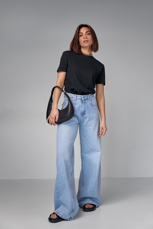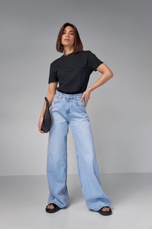 Принт смайла, выполненный в выпуклой технике, придает футболке объемность и привлекательность. Сама футболка идет с короткими рукавами, прямым низом и бейкой на круглой горловине.