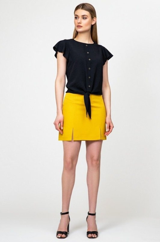 Классическая юбка мини из костюмной ткани с небольшыми разрезами спереди. Застегивается на потайную молнию сзади.