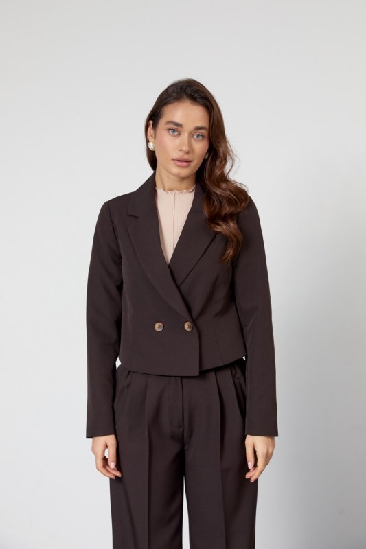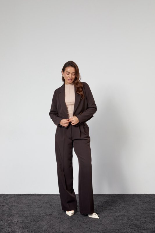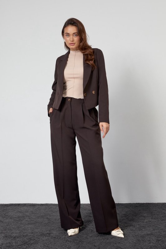 Классический костюм с укороченным жакетом брюки палаццо. Жакет с двубортной застежкой, воротник пиджачного типа. Полочка с декоративным карманом, с талиевыми выточками. Рукава втачные, длинные, двухшовные, по низу шлицы и пуговицы. Брюки палаццо прямого кроя. На талии шлевки для съемного пояса. Застежка: пуговица и скрытая молния. Передние половинки со стрелками и складками. Карманы находятся в боковых швах. Задние половинки с выточками.