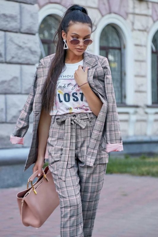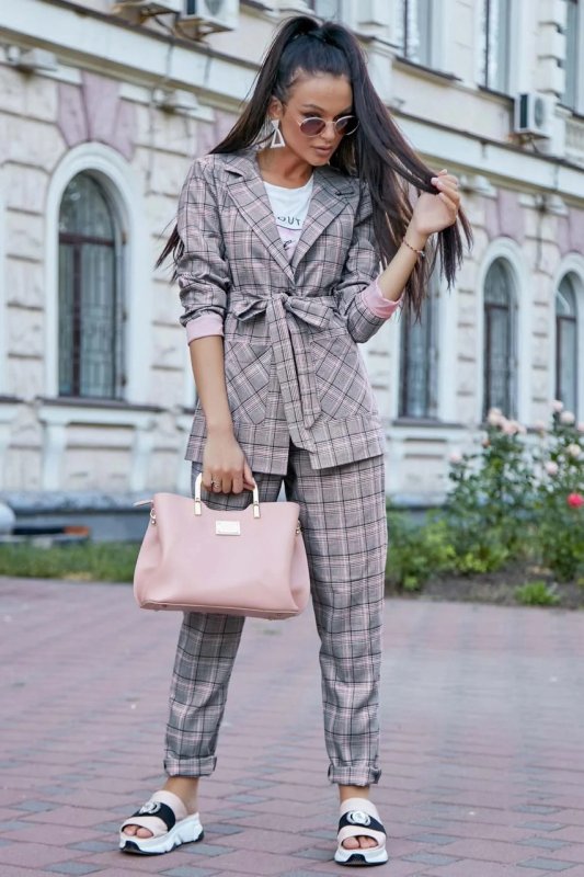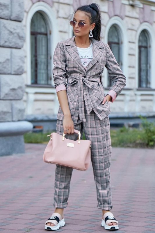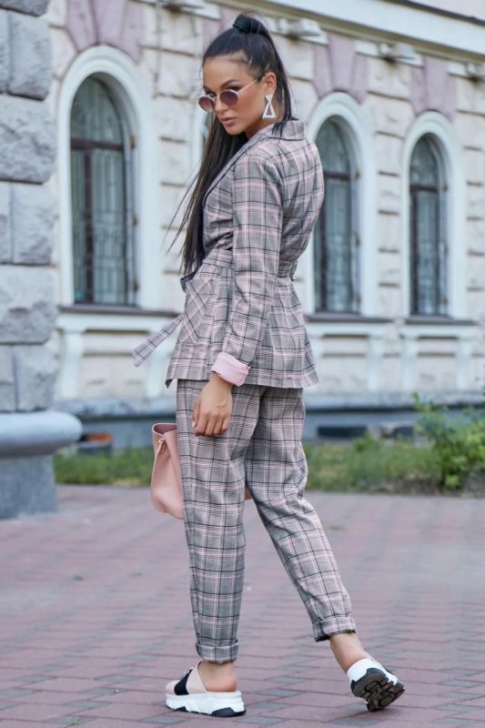Классический молодежный женский костюм коллекции Dominica для создания делового стиля. Широкие брюки с высокой посадкой помогут скрыть любые недостатки талии и будут смотреться всегда хорошо на девушках с любым типом силуэта. А чтобы образ был завершенным и помог выглядеть стильно - используйте прямой пиджак оверсайз, с практичными карманами. Вопрос “с чем носить” костюм однозначно имеет несколько ответов, так как летнее время требует стильных босоножек с высокой подошвой, осенью стоит подобрать кроссовки под льняное изделие в серо-розовую клетку и даже туфли на высоком каблуке лишь усовершенствуют наряд.