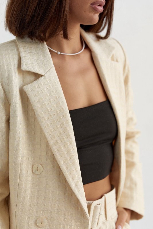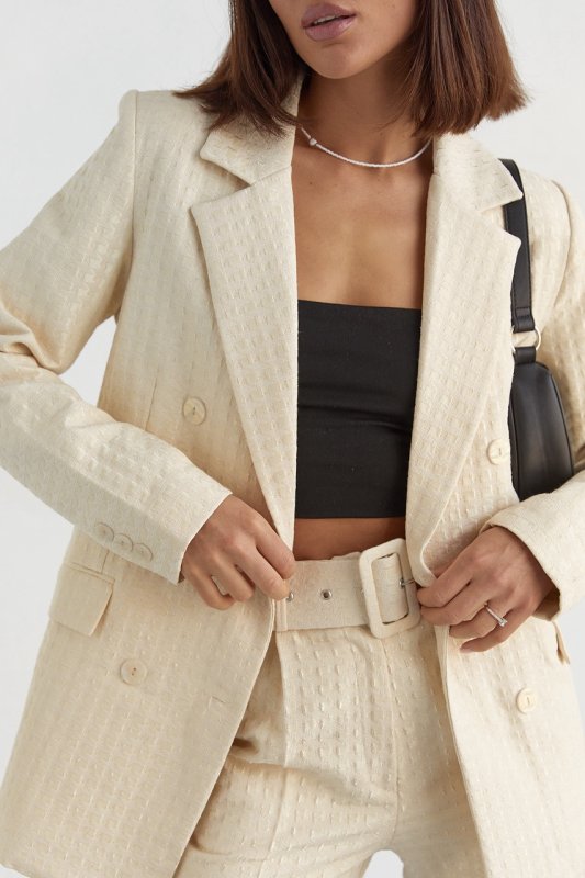 В комплекте женские брюки с высокой талией имеют широкий отрезной пояс со шльовками и с прямыми краями внизу. Спереди расположены функциональные кармашки. Брюки спереди застегивается на две пуговицы и потайную молнию. Пиджак идет на тонкой подкладке, с вшитыми поролоновыми плечиками и застегивается спереди на пуговицы в два ряда. Низ в пиджаке прямой, рукава длинные, а V-образный вырез горловины дополнен отложным английским воротником. Также спереди пришиты клапаны, без карманов.