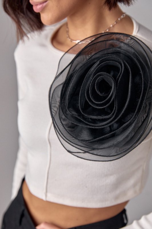 Короткий джемпер в рубчик с объемным цветком - 12380 черный