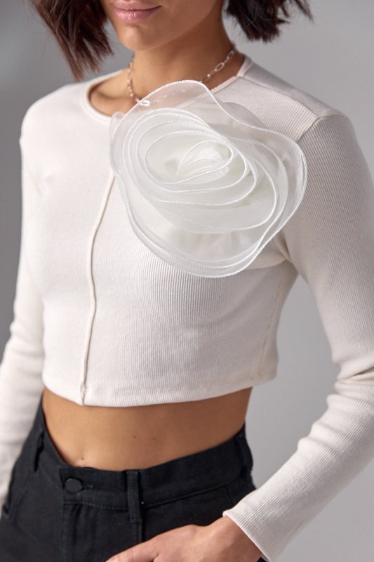 Короткий джемпер в рубчик с объемным цветком - 12380 кремовый