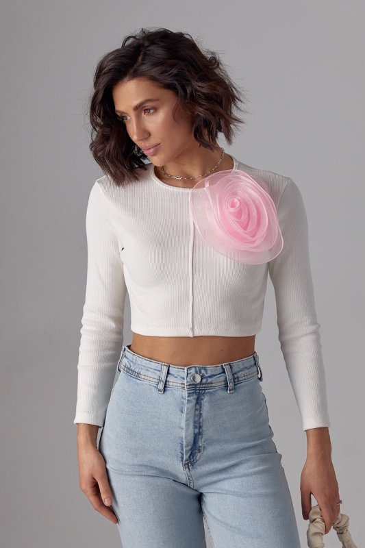 Короткий джемпер в рубчик с объемным цветком - 12380 розовый