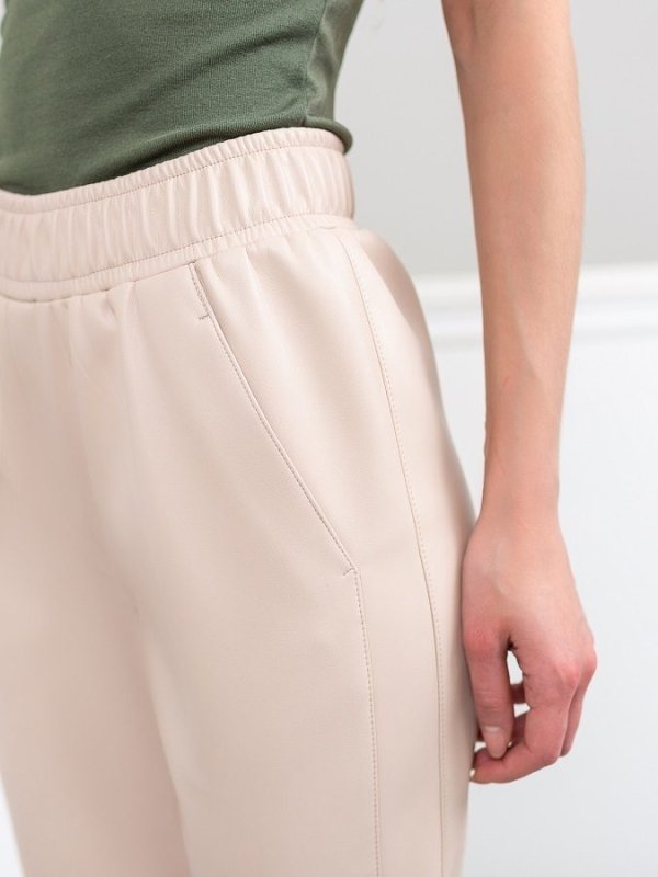 Кожаные брюки зауженного кроя высокой посадки на эластичном перестроченном поясе. Декоративный гульфик, косые карманы по бокам. Подрез по ноге, переходящий в карман.