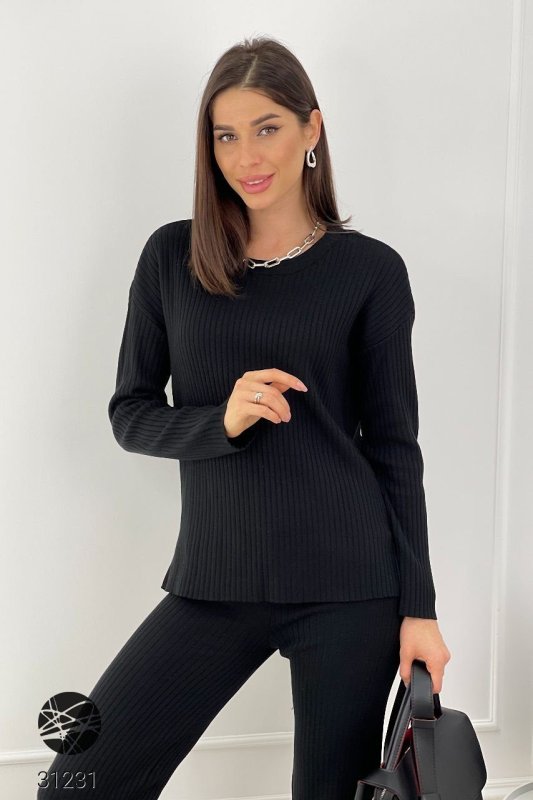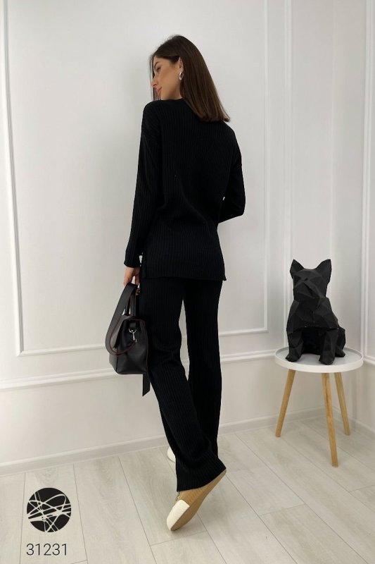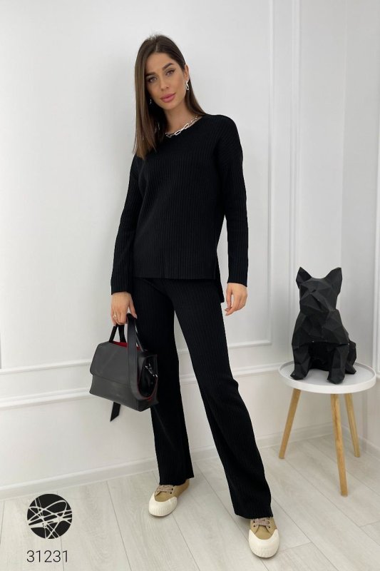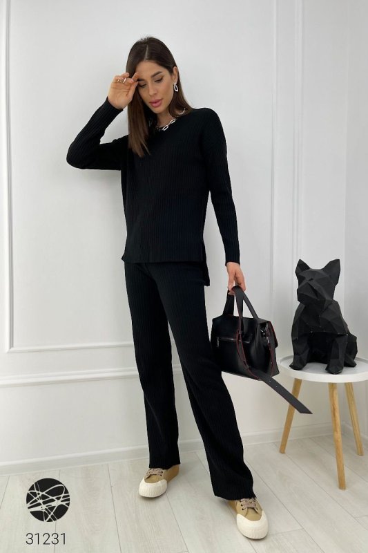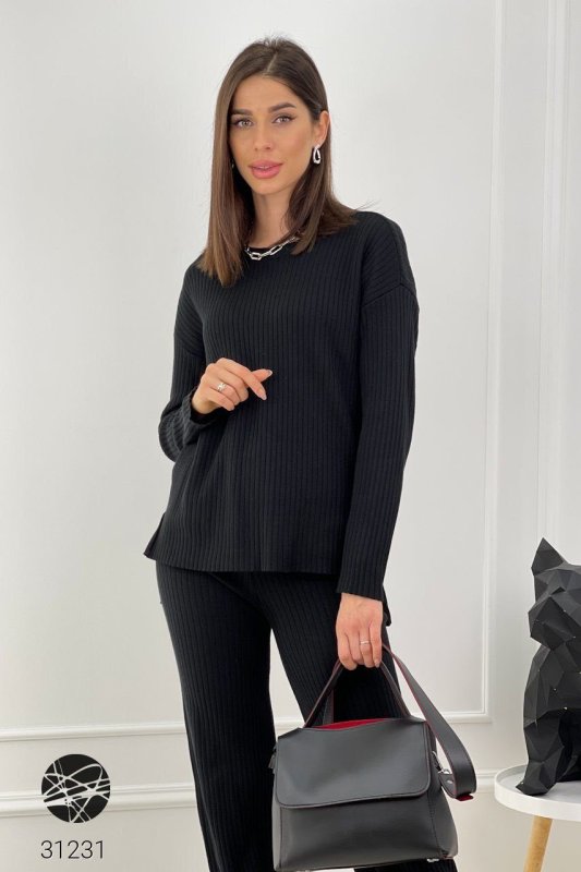 Костюм из качественного трикотажа, производства Турции. Джемпер с круглым вырезом, заниженная линия плеч, асимметричный нижний край с боковыми разрезами. Брюки-палаццо с завышенной талией, пояс на резинке. Состав ткани: 50% - вискоза, 50% - акрил.