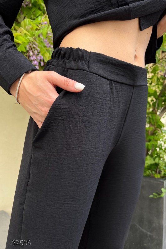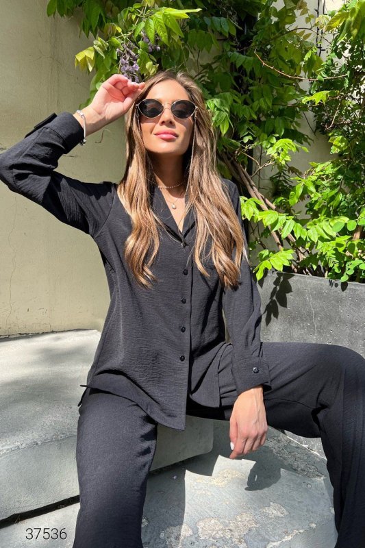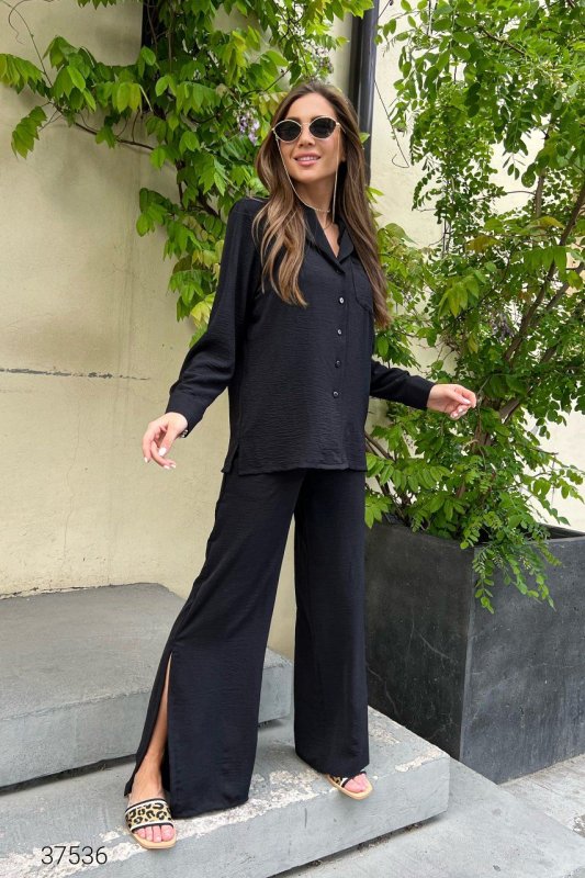 Костюм из рубашки и брюк. Рубашка застегивается на пуговицы. Брюки на резинке с разрезами снизу.