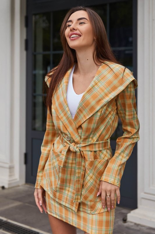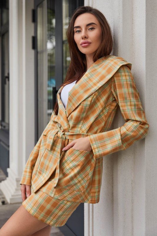 Необычный и оригинальный костюм с юбкой в классическую клетку станет изюминкой в вашем гардеробе. Костюм прямого силуэта с оригинальным воротником-капюшоном, такое дизайнерское решение придает модели стиля и уникальности.