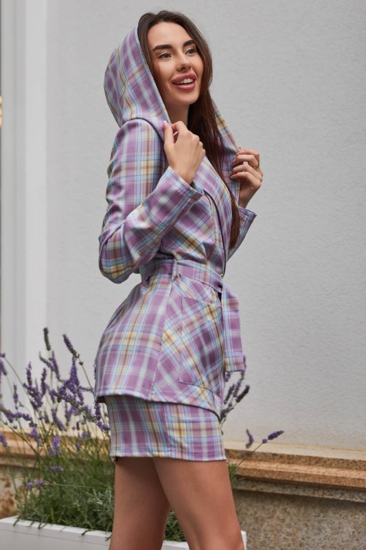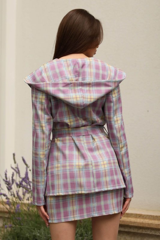 Необычный и оригинальный костюм с юбкой в классическую клетку станет изюминкой в вашем гардеробе. Костюм прямого силуэта с оригинальным воротником-капюшоном, такое дизайнерское решение придает модели стиля и уникальности.