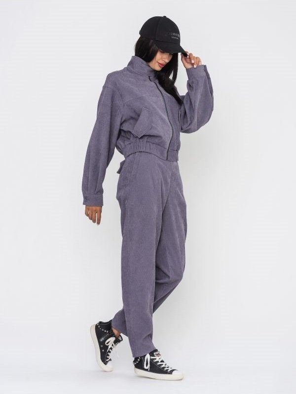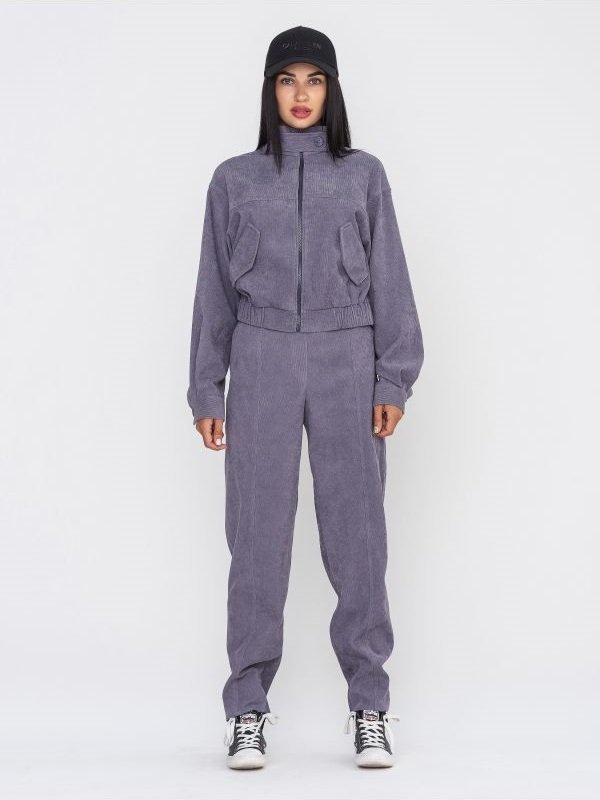 Состоит из бомбера и брюк-бананов. Бомбер свободного кроя застегивается на молнию. Воротник-стойка дополнен шлевкой и пуговицей. По бокам удобные косые карманы с клапанами. Сзади декоративная шлевка. Широкий манжет по краю, по бокам куртки вставки из резинки.