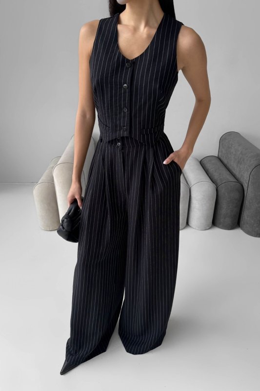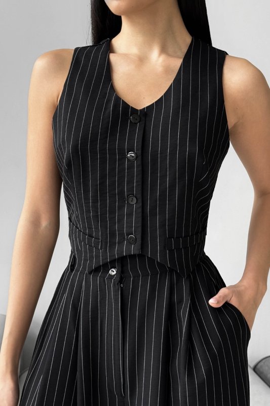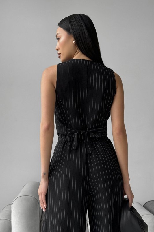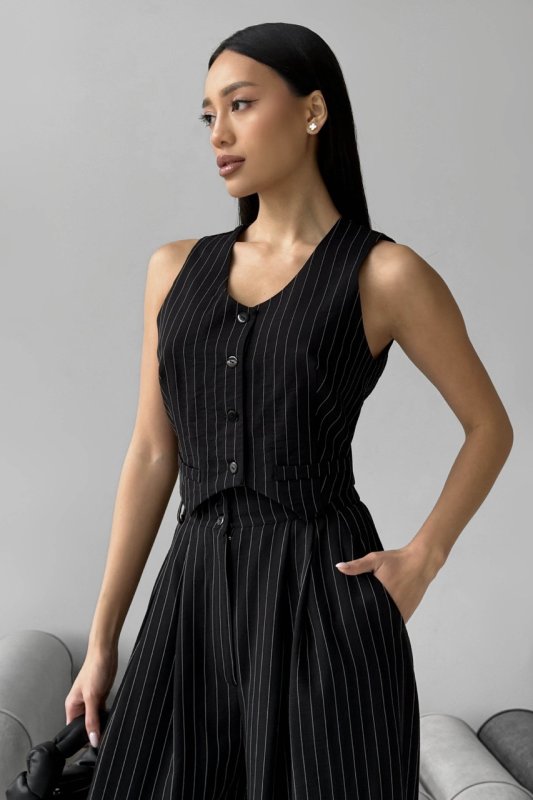 Базовый жилет из костюмной ткани в тонкую полоску – это всегда элегантно и изысканно. Классический крой модели дополнен карманами-обманками. Застегивается жилет на пуговицы спереди, на спинке завязки. Жилет можно носить как самостоятельный элемент образа, так и в комбинации с рубашкой или блузой.