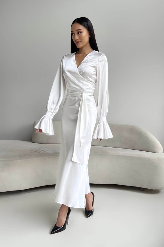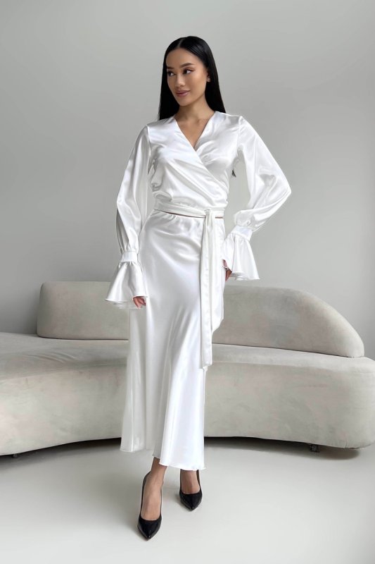 Юбка – миди с резинкой по талии свободного кроя и блуза на запАх с длинным поясом. На рукавах манжеты с воланами.