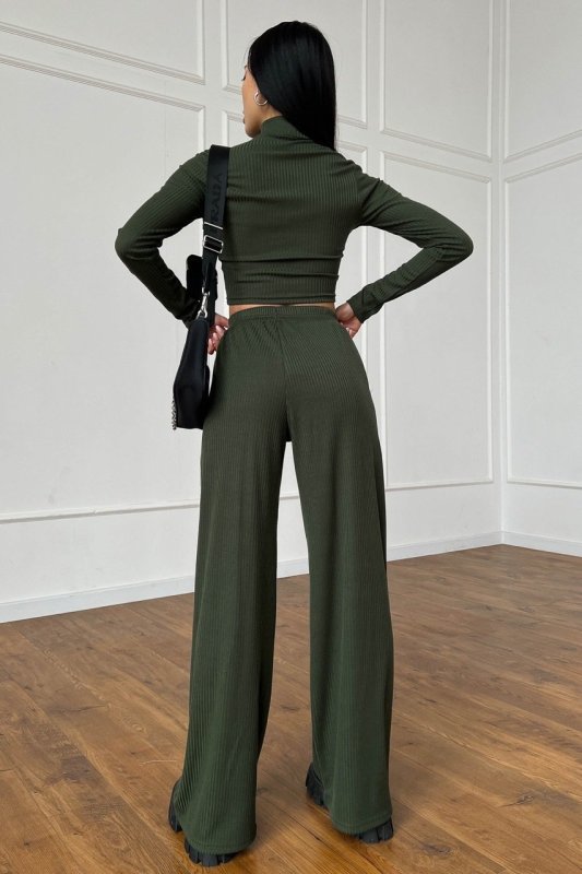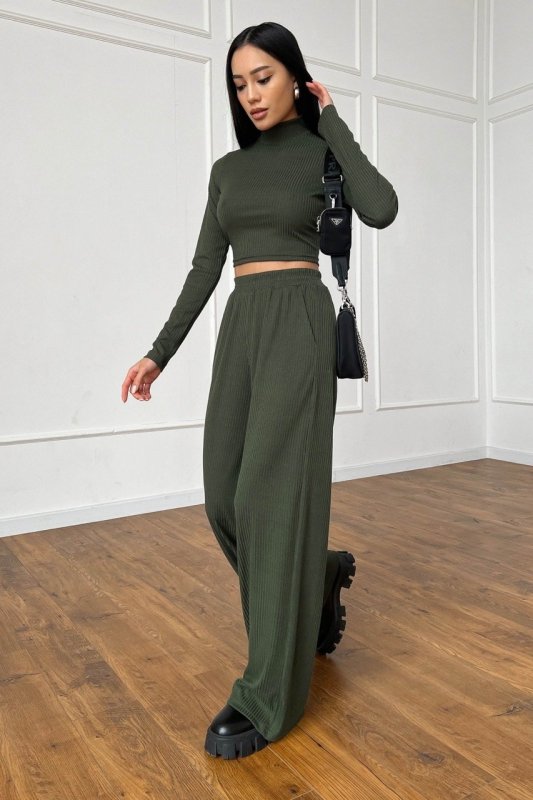 Костюм двойка – кроп-топ и брюки кюлоты, изготовленные из мягкого трикотажного материала. Модель верха – кроп-топ с горловиной стойкой и длинным рукавом. Брюки кроя палаццо с эластичной вставкой в талии. Трикотаж в рубчике обеспечивает удобство и придает образу фактурности. Модель костюма прекрасно сочетается с верхней одеждой из нашего каталога.