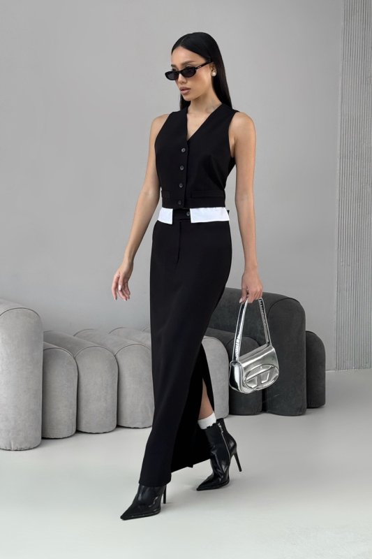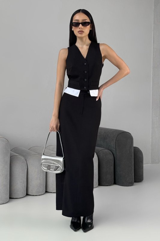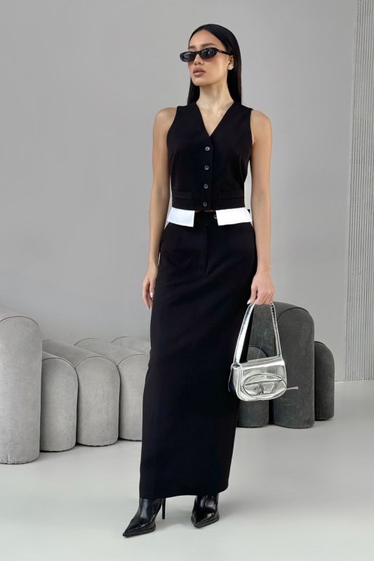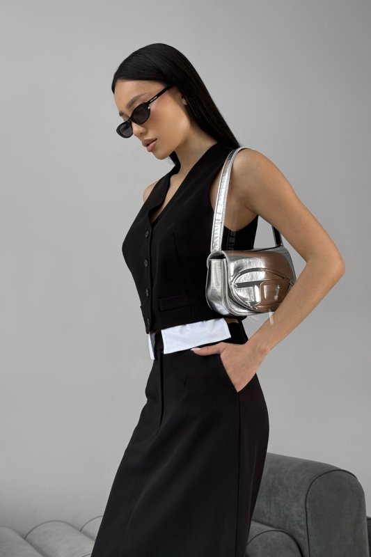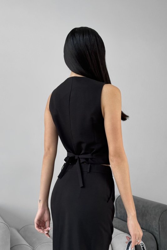 Базовый однотонный жилет из костюмной ткани – это всегда элегантно и изысканно. Классический крой модели дополнен карманами-обманками с декоративными контрастными клапанами. Застегивается жилет на пуговицы спереди, на спинке завязки. Жилет можно носить как самостоятельный элемент образа, так и в комбинации с рубашкой или блузой.