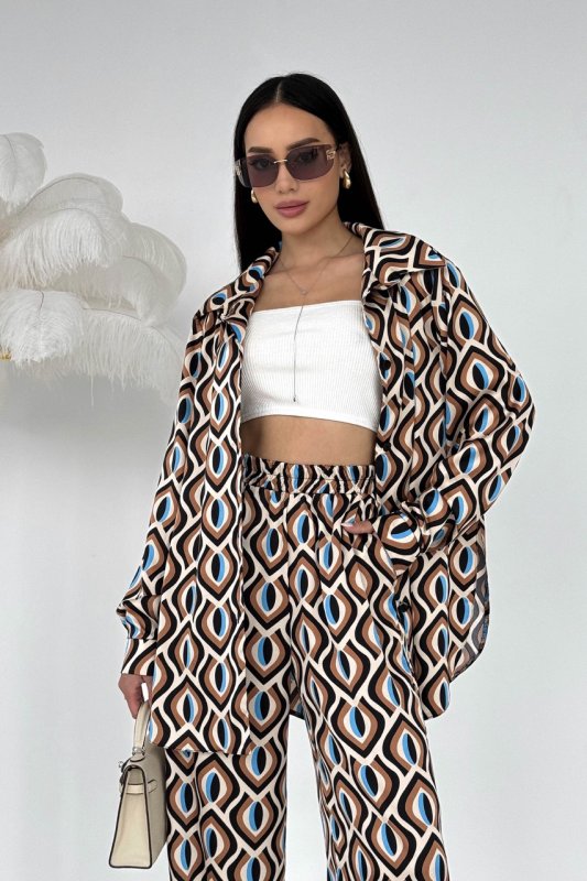 Свободный костюм прямого кроя с рубашкой oversize станет верным спутником в летнюю жару. Такая модель будет удачно и гармонично смотреться со спортивной обувью, а также с высокой танкеткой или каблуком. В боковых швах на брюках предусмотрены карманы, они придают модели удобство в использовании.