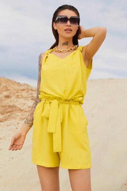 Трендом лета 2021 уже стали костюмы из лёгкого американского крепа. Топ на бретелях в виде декоративных узлов придадут образу стиля. Свободный силуэт топа придаст движениях свободы и раскованности. V-образный вырез позволит подернуть линию декольте. Шорты на высокой посадке свободного силуэта прибавят трендовости.