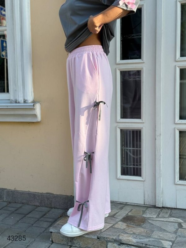Костюм женский с бантиками. Модель свободного кроя, ширину штанины можно корректировать хлопчатобумажными лентами.