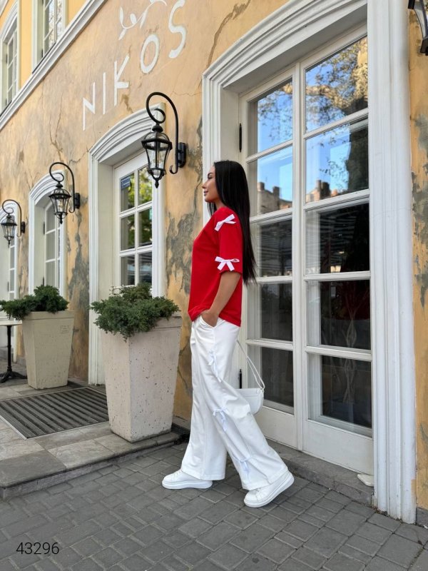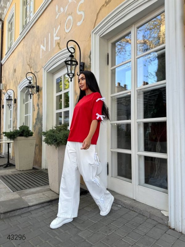 Костюм женский с бантиками. Модель свободного кроя, ширину штанины можно корректировать хлопчатобумажными лентами.