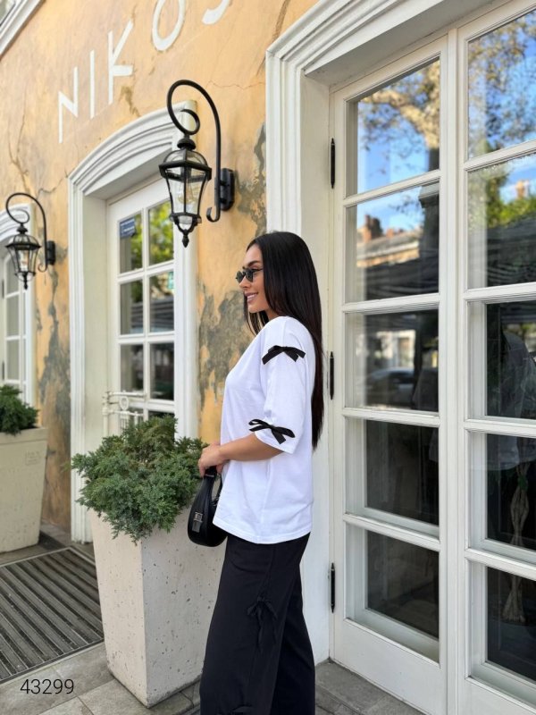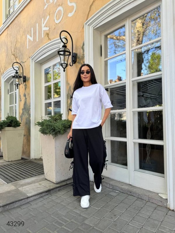 Костюм женский с бантиками. Модель свободного кроя, ширину штанины можно корректировать хлопчатобумажными лентами.