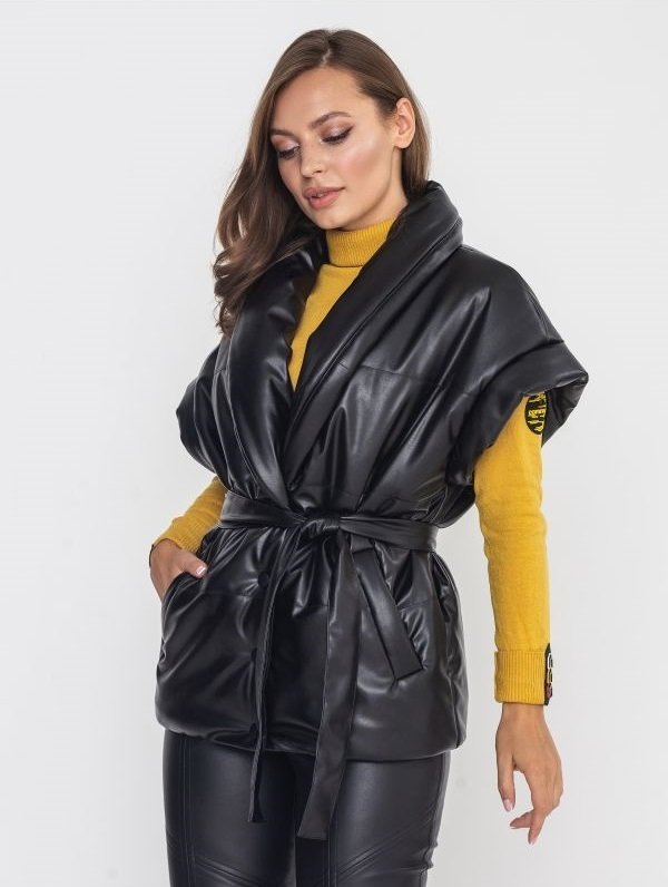 Красивый, стильный и теплый кожаный жилет на синтепухе. Застегивается на кнопки, дополнен утепленным шалевидным воротником. По бокам косые карманы с листочками. Съемный пояс из основного материала в комплекте.