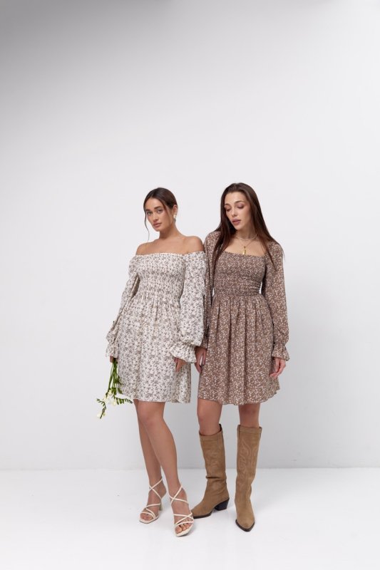Легкое летнее платье длиной выше колен. Лиф собран резинкой по всей длине и ширине. Юбка собрана на талии. Рукава длинные, верхняя часть собрана резинкой и функционирует, как бритель. Низ рукава собран с образованием рюши. Резинка для волос в комплекте