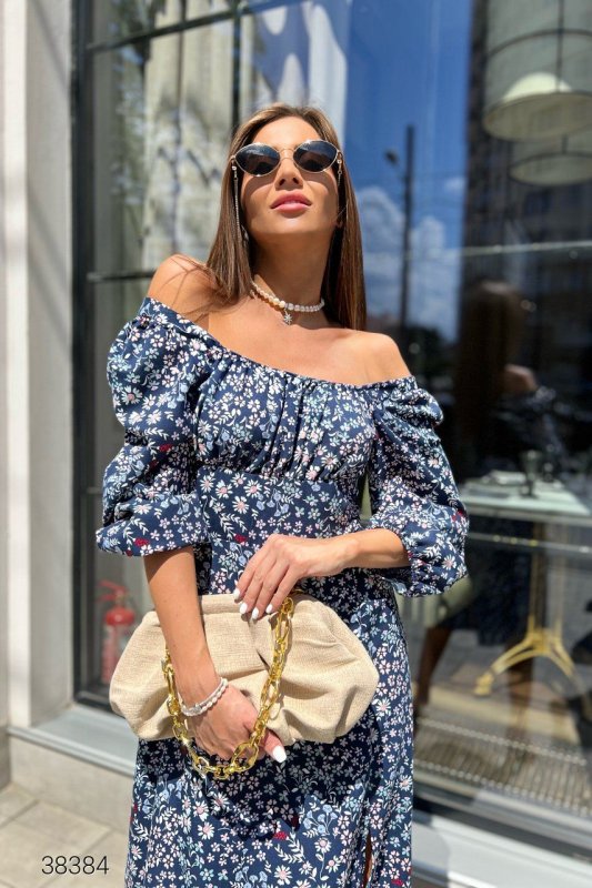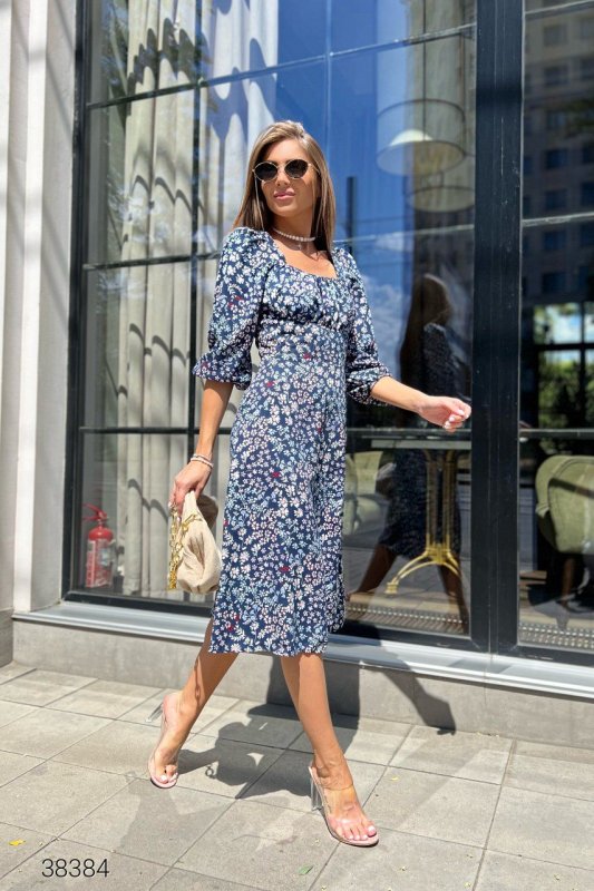 Лёгкое летнее платье. На груди резинка. На спине потайная змейка. Спереди боковой разрез на юбке.
