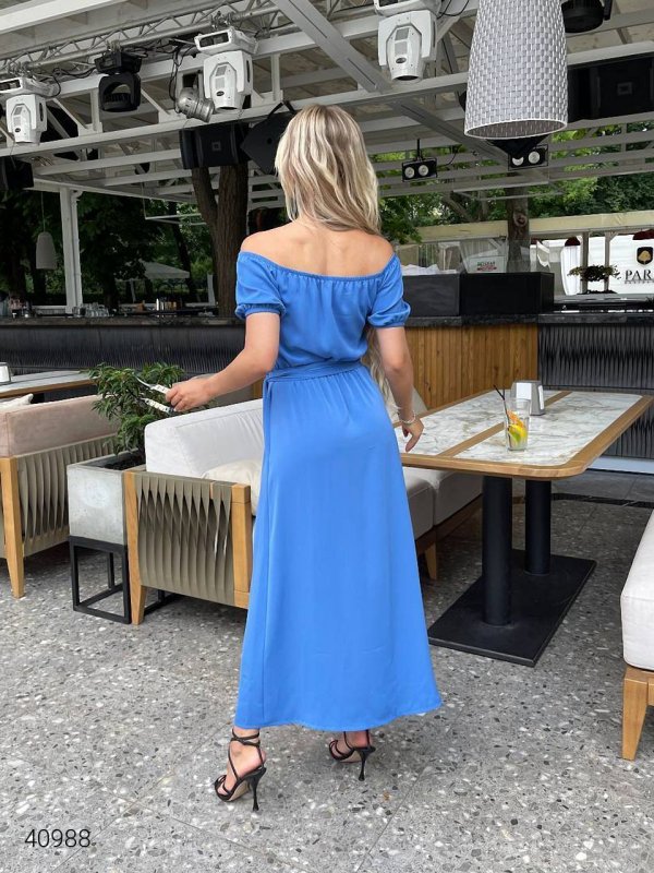 Летнее платье с открытыми плечами. Спереди разрез. Пояс в комплекте.