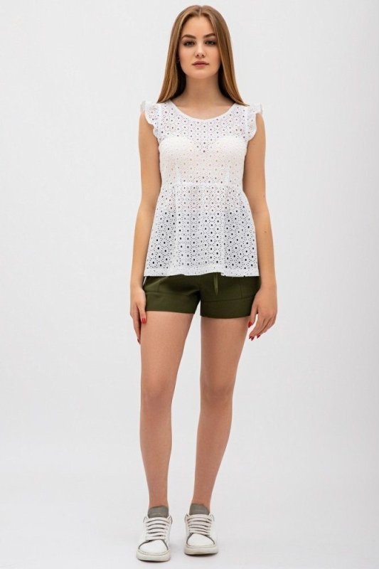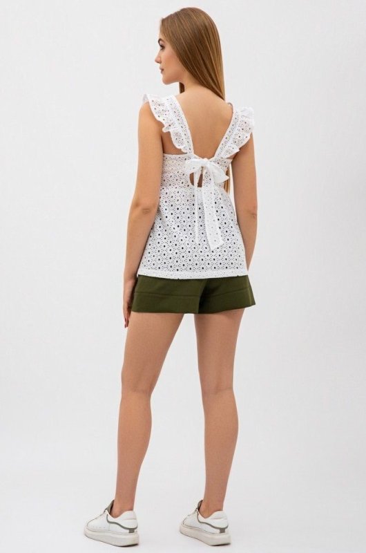 Летний топ из прошвы с нежными оборками на бретелях и с завязками-бантом на спине.