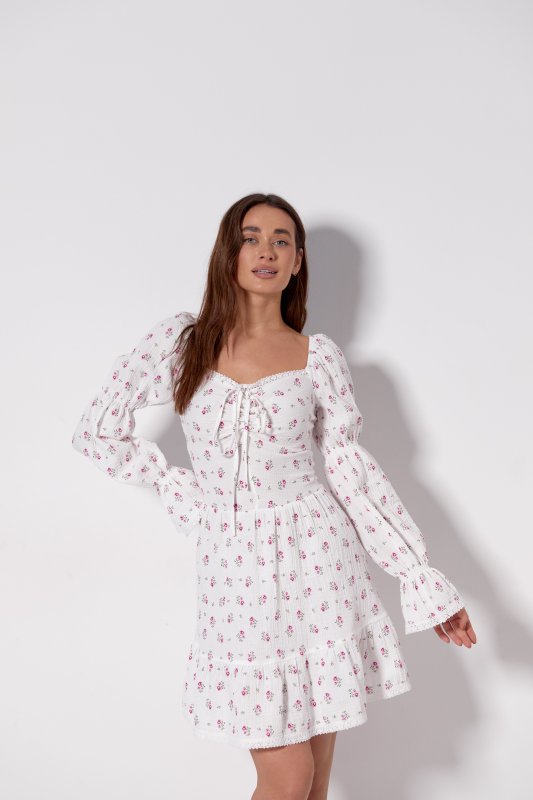 Однотонное муслиновое платье мини, принт цветы. Вырез горловины с рюшей. Спереди со сборкой на груди. Юбка – клеш, собранная на талии, по низу юбки рюша. Рукава длинные. По верху и по низу рукава резинка. Спинка собрана резинкой, гарантирующей прилегание.