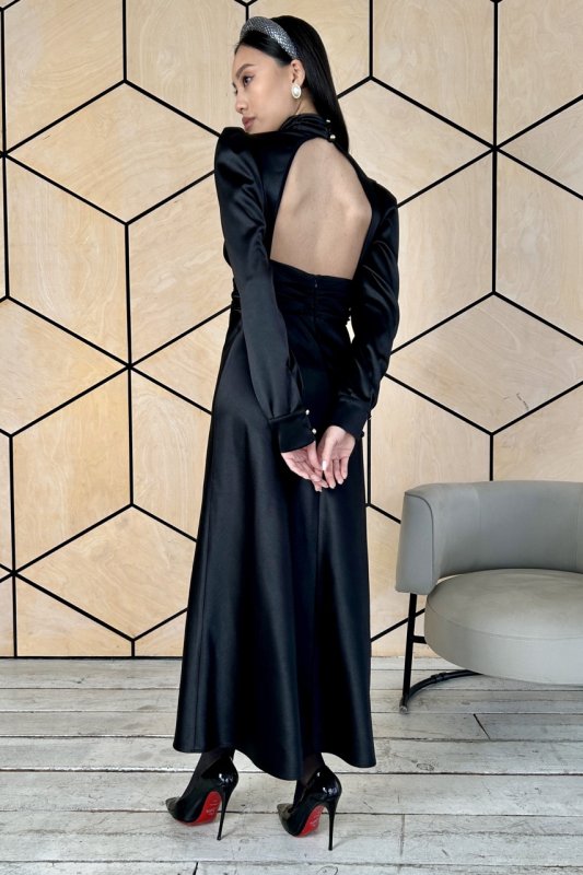Элегантное платье с открытой спиной, воротничком стойким и длинным рукавом выглядит шикарно. Эта модель идеально подойдет для важных событий и торжественных мероприятий. Платье, которое придаст вам неповторимый шарм и изысканность. Наслаждайтесь вниманием и восхищением окружающих в этом великолепном наряде.