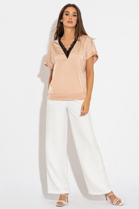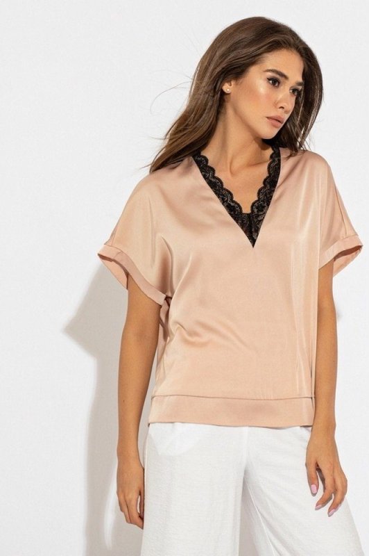 Нежная блуза свободного кроя, с глубоким v-образным вырезом, украшенным кружевом и цельнокроеным коротким рукавом.