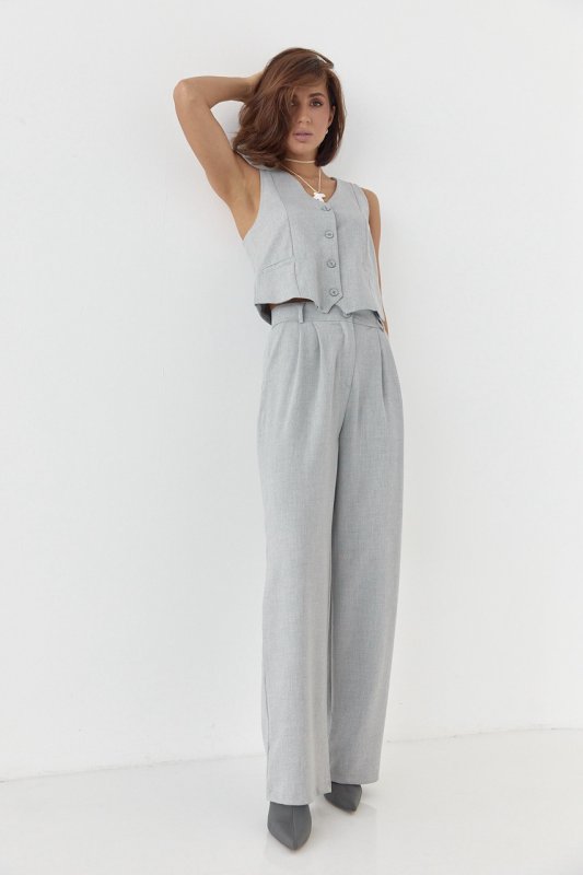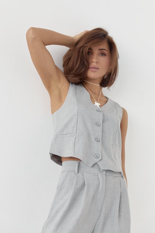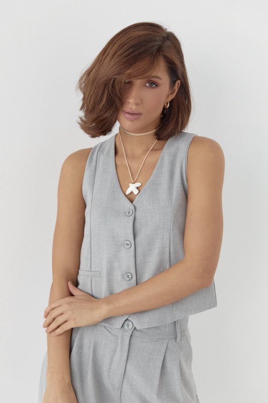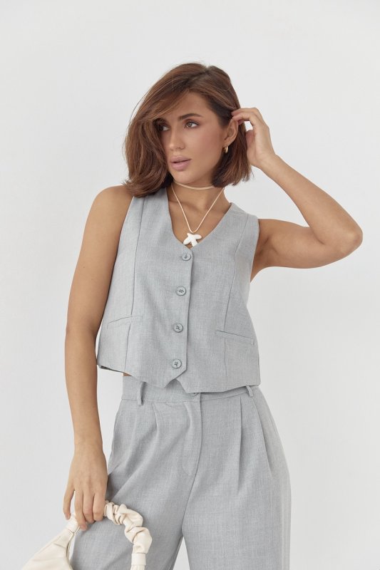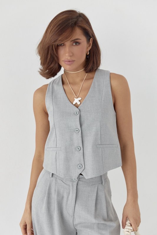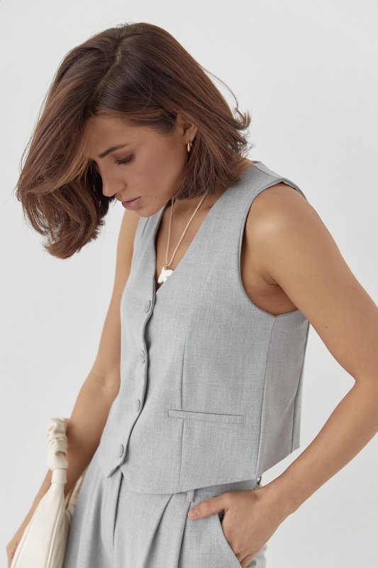 Эта модель дополнена тонкой гладкой подкладкой, и идеально подойдет под классические брюки и юбки. Жилет с V-образной горловиной и фигурным низом спереди застегивается на пуговицы и декорирован имитацией прорезных карманов с листочкой. Также спереди и сзади расположены рельефные швы для лучшей посадки жилета по фигуре.