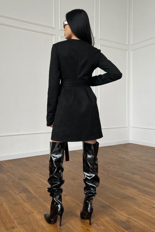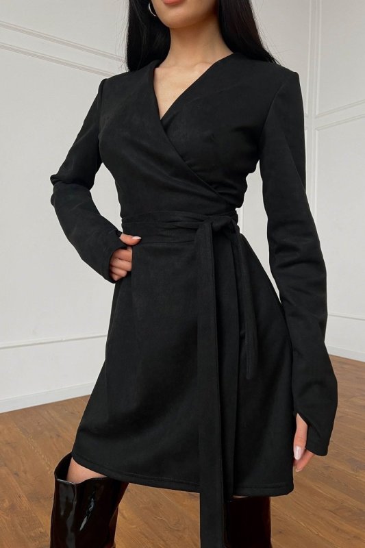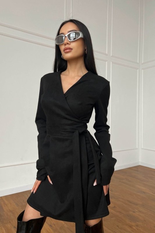 Стильное платье мини выполнено из мягкого материала эко-замши. Модель стилизована составами на талии, помогающими сделать дополнительный акцент на женских изгибах фигуры. Лиф на запАх, пояс вшит. Рукав длинный, запах формируется двумя полу поясами. На рукавах трендовые митенки для пальца.