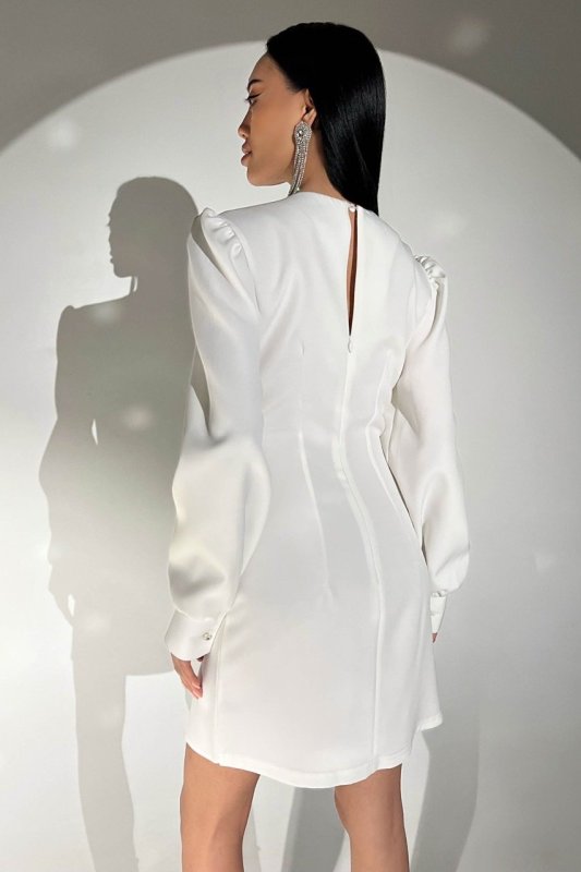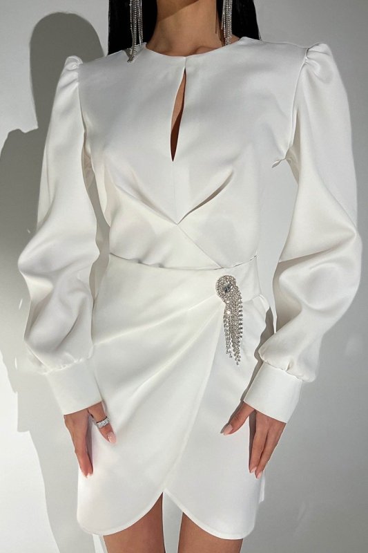 Шикарное платье для вечерних торжеств и официальных приёмов. Если Вам нужно стильное и элегантное платье – Ваш выбор очевиден. Мягкость и женственность изделия придает двойная юбка фиксированная в боку, мягкие бантовые склады под грудью, объемный рукав со складами сверху и снизу на широком манжете с пуговицами. Декоративный разрез в области груди изящно открывает зону декольте. Красоту платья дополняет изысканная брошь.