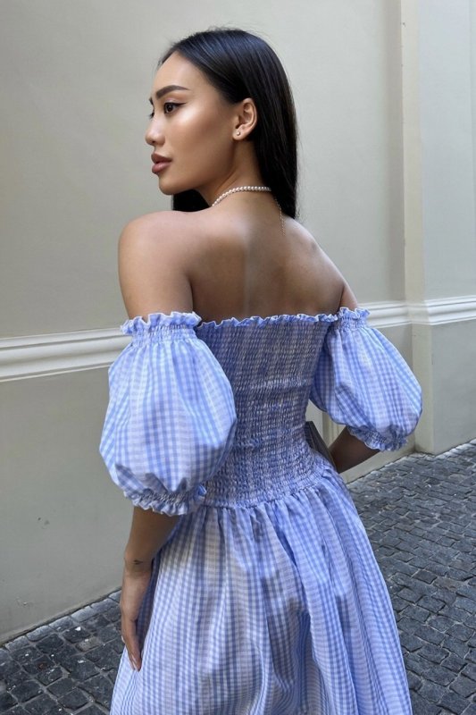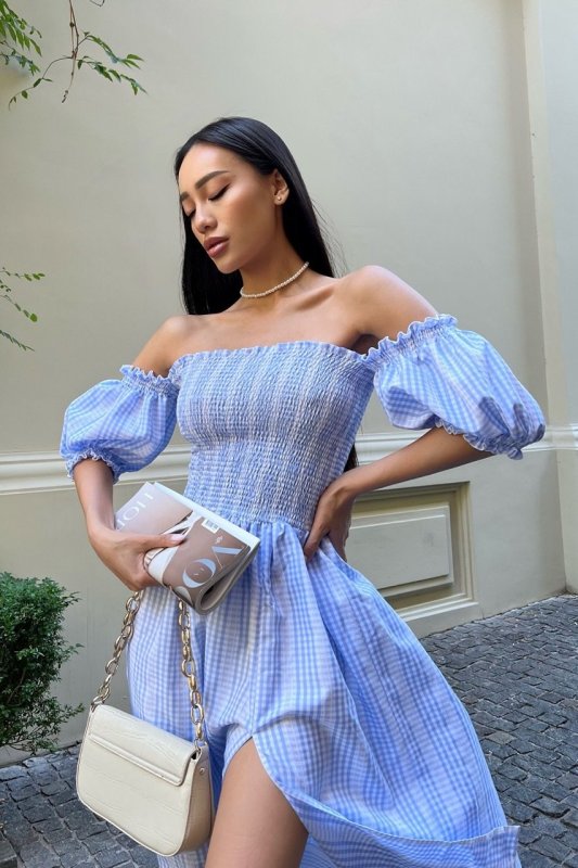 Оригинальное летнее платье из воздушной ткани в клетку. Открытые плечи и эффектный длинный рукав-фонарик. Шикарная расклешенная юбка с высоким разрезом, дополняет эластичный лиф.