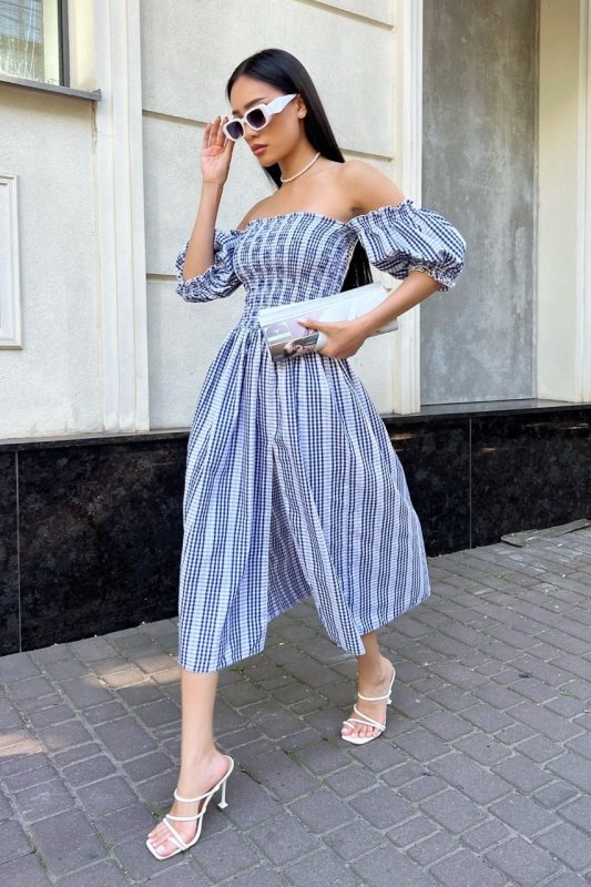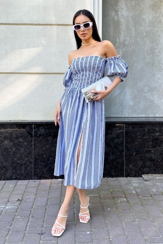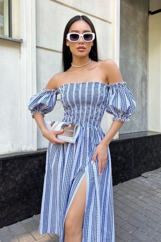 Оригинальное летнее платье из воздушной ткани в клетку. Открытые плечи и эффектный длинный рукав-фонарик. Шикарная расклешенная юбка с высоким разрезом, дополняет эластичный лиф.
