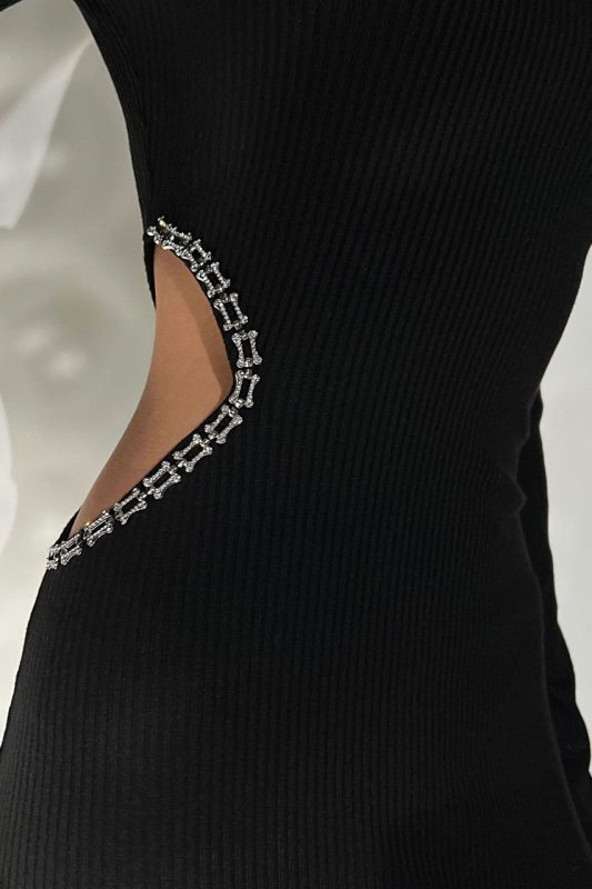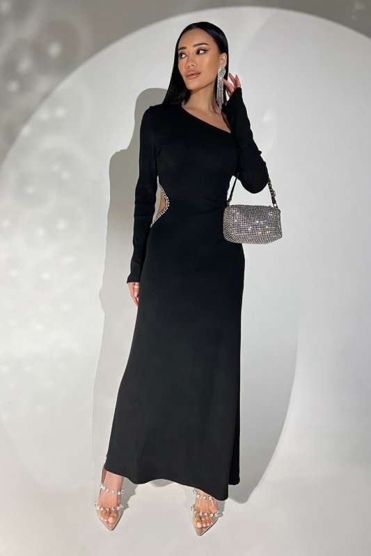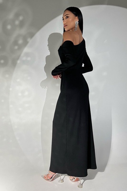 Невероятное, соблазнительное, стильное, дерзко модное – все это о нашем новом платье! Черное платье-миди выполнено из трикотажного материала, прекрасно садящегося по фигуре. Модель стилизована асимметричным вырезом со стороны. Платье представлено с открытым плечом, что придает образу женственности и изысканности. Прекрасный образ для выхода на вечер! Платье украшено цепочкой с камешками.