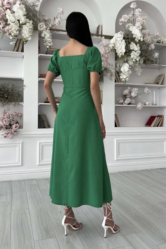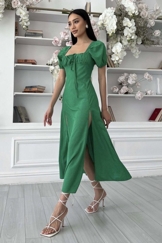 Летнее платье-миди романтического кроя. Выполнена из принтованной ткани (горошок), струящейся. Модель украшает фигурный вырез и драпировку по лифу, что подчеркивает зону декольте. Короткий рукав-фонарик с эластичной манжетой. Длинная юбка а-силуэта подчеркивает линию талии. На юбке предусмотрено два разреза.