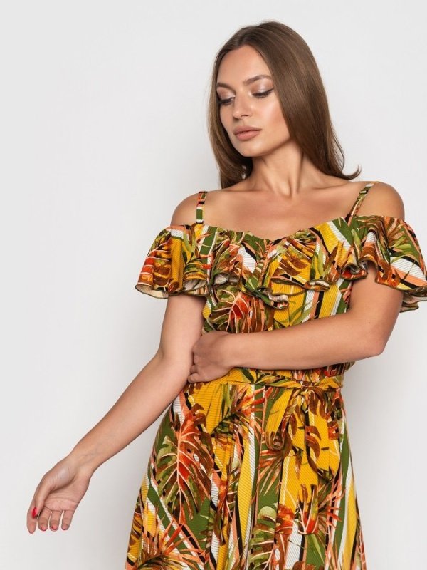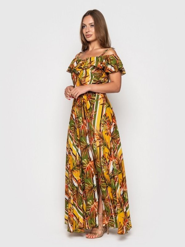Эффектное платье длины макси с кокетливой оборкой по воротнику. Модель дополнена съемными регулируемыми бретелями. По талии проходит эластичная вставка. Вдоль линии бедра - разрез. В комплекте съемный тканевый пояс в тон платья.